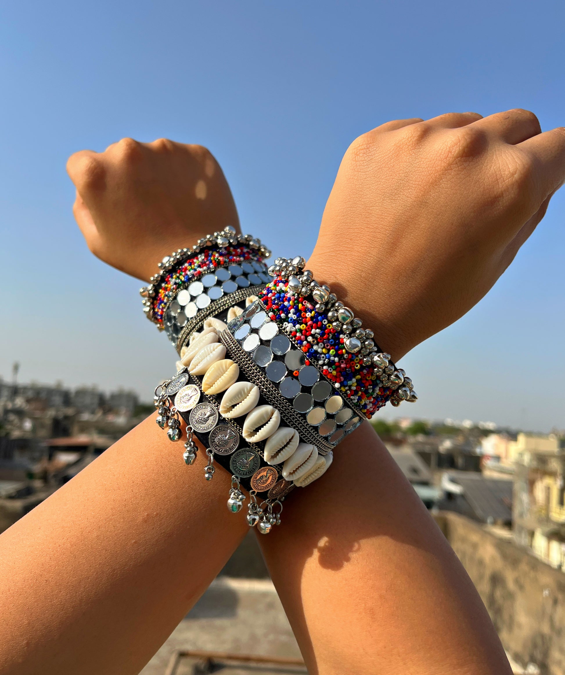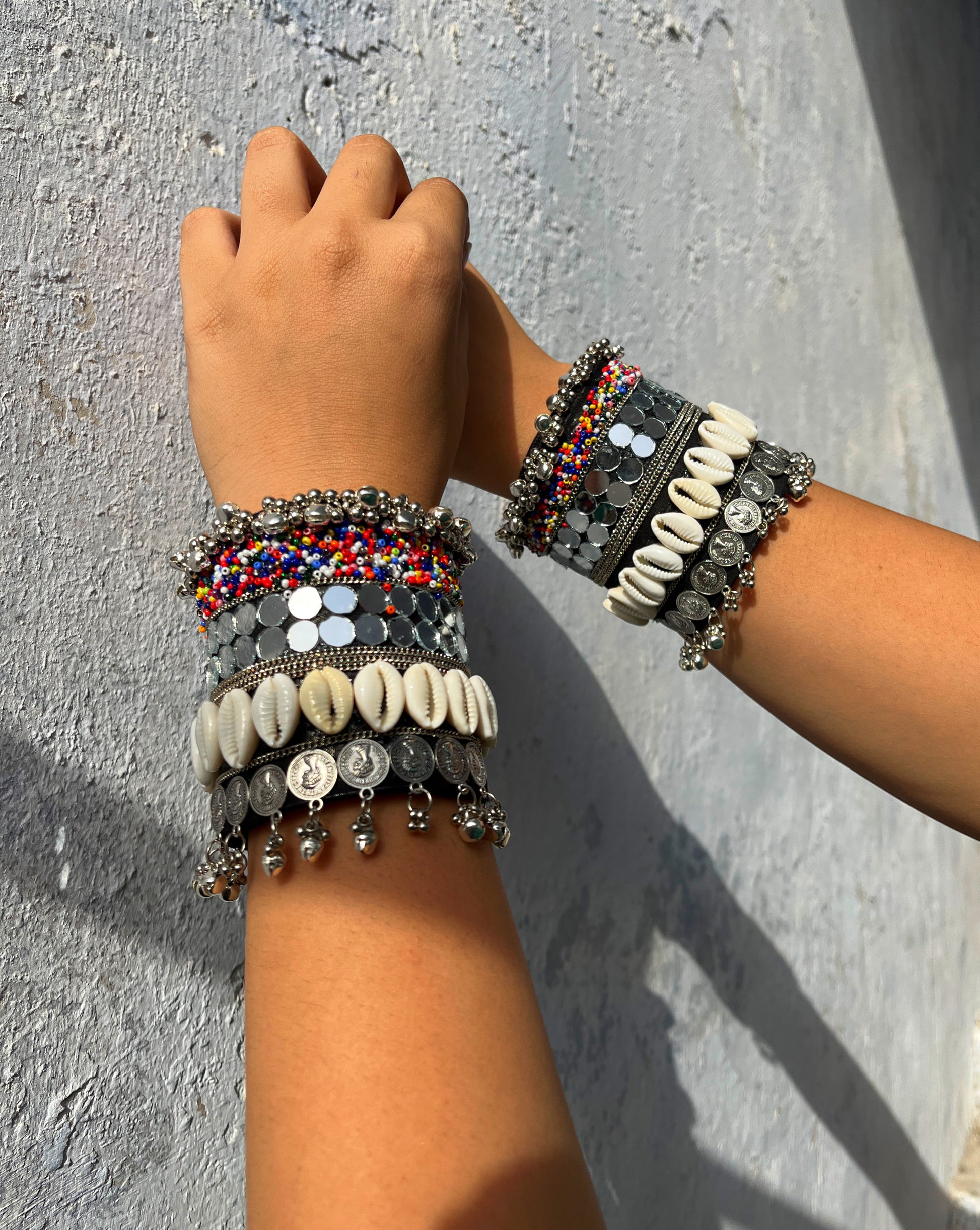 These handcuffs are an absolute showstopper! The mix of shells, ghungroos, coins, and mirrors gives a perfect traditional-meets-modern vibe. A must-have for boho lovers!👍🏻❤️