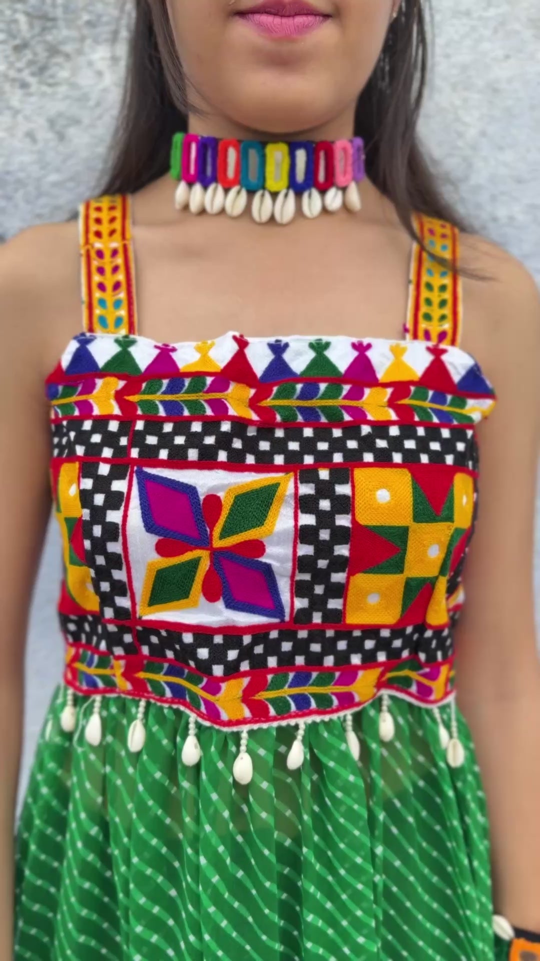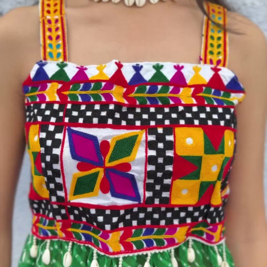 Embrace bohemian flair with our strappy kurti, a fusion of free-spirited design and artisanal craftsmanship. This kurti features a flattering silhouette with delicate straps that frame the shoulders, perfect for warm weather. The focal point is the incorporation of Kutchi work patches, meticulously placed to add a touch of vibrant heritage. These intricate patches showcase traditional mirror work and embroidery, creating a captivating visual texture.