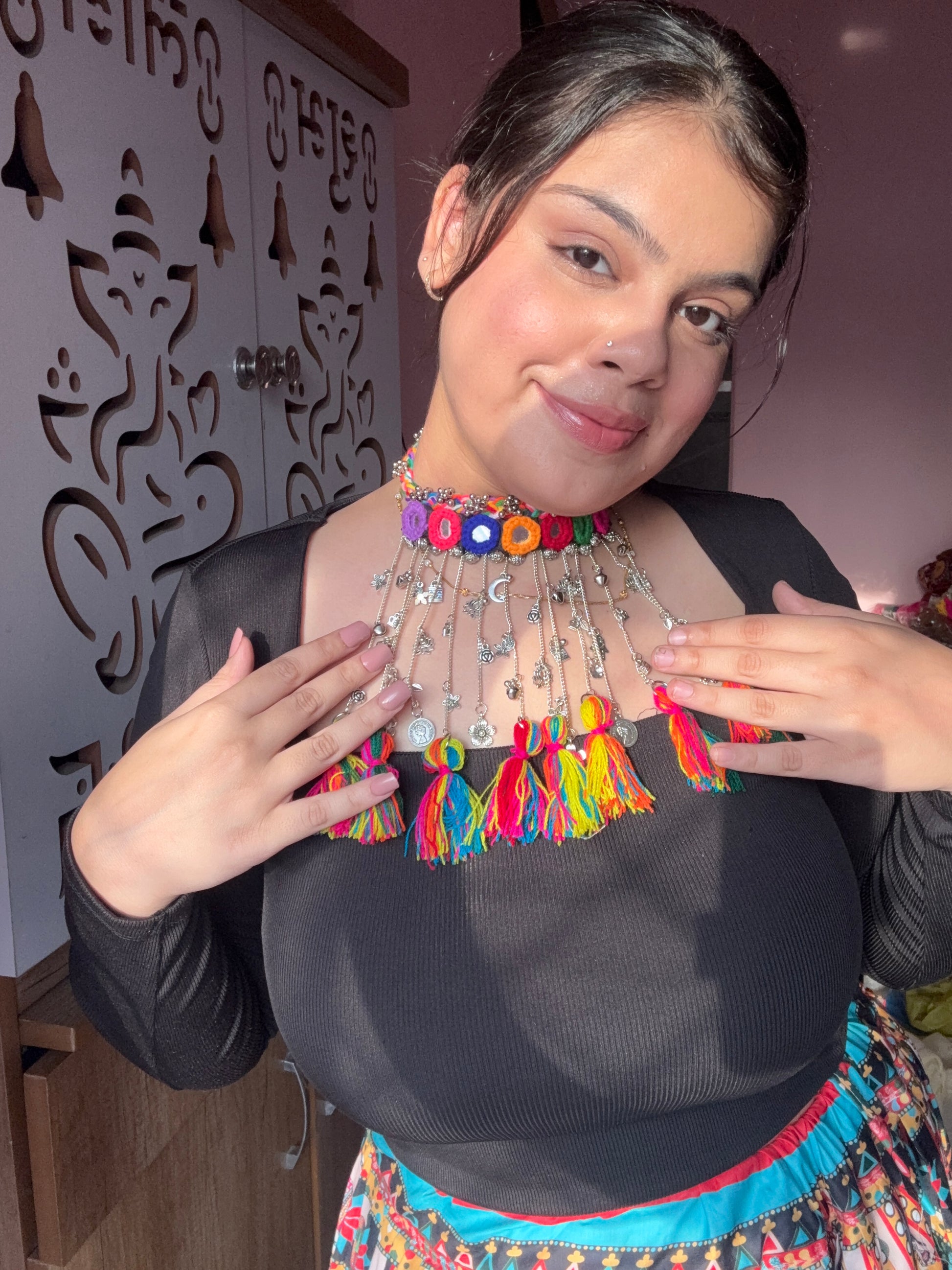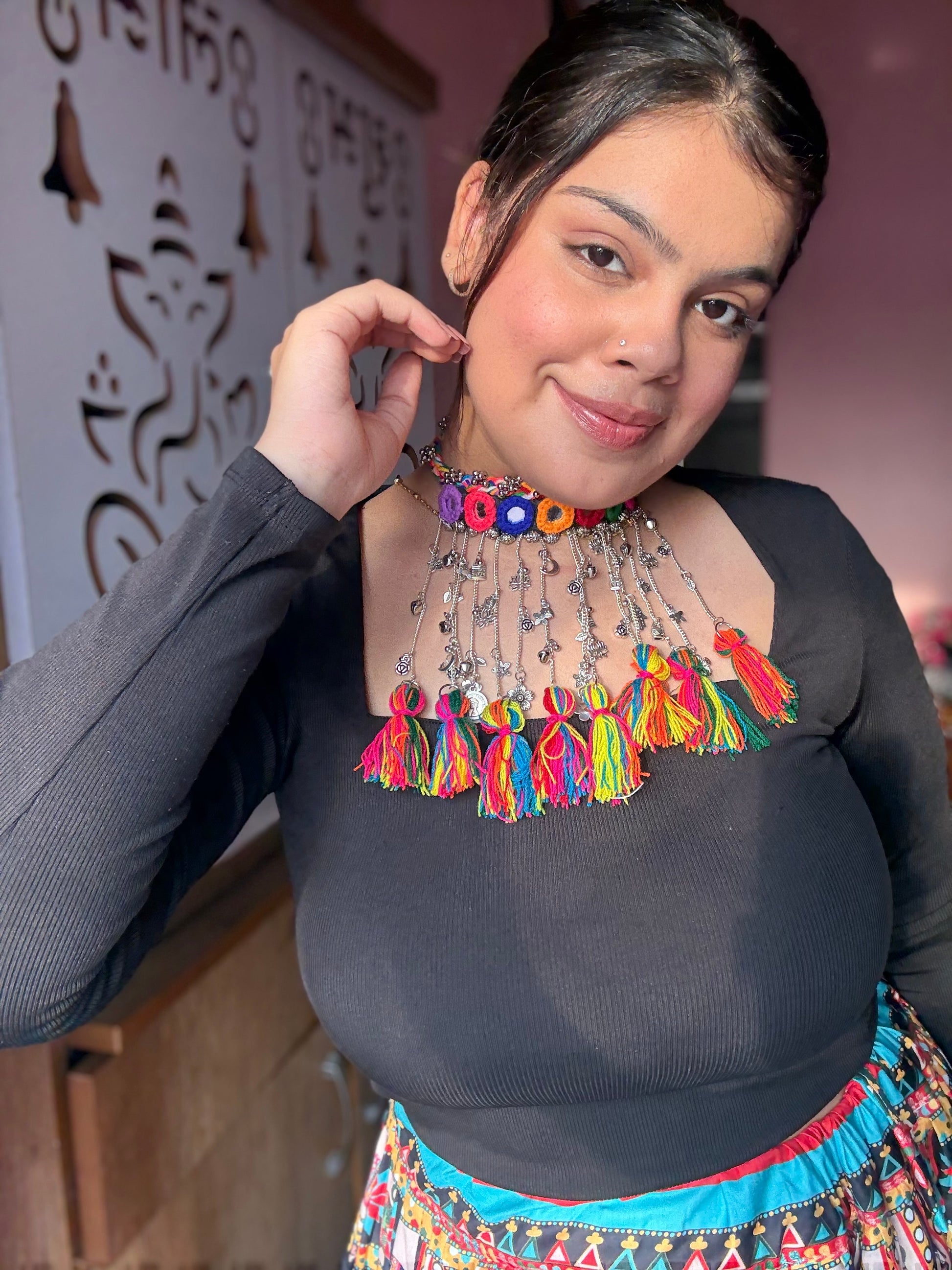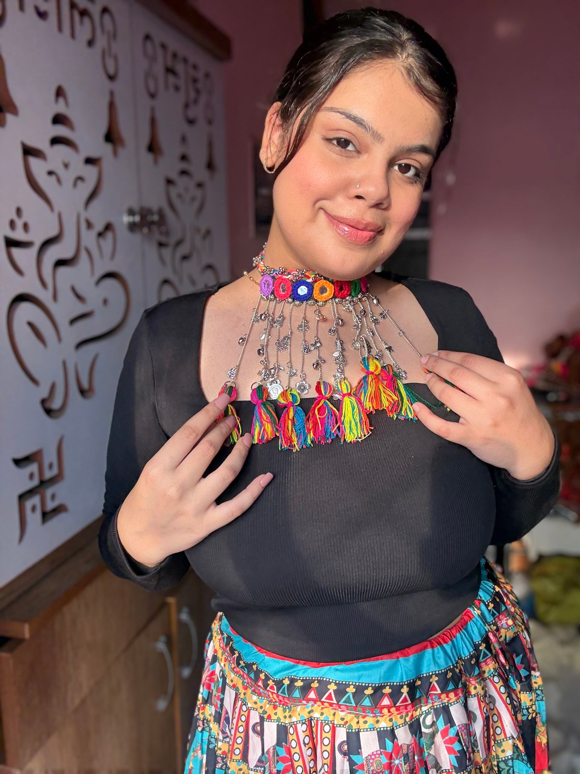 This neckpiece is straight-up fire, inspired by those epic Navratri nights. It's got all the colors, hand-embroidered with mirrors that catch the light. Think moon and lotus vibes, plus dangly bits that move when you do. And the best part? Ghunghroo bells for that *chef's kiss* sound when you're dancing or doing the Garba. Total main character energy and a perfect gift for your bestie! 💯