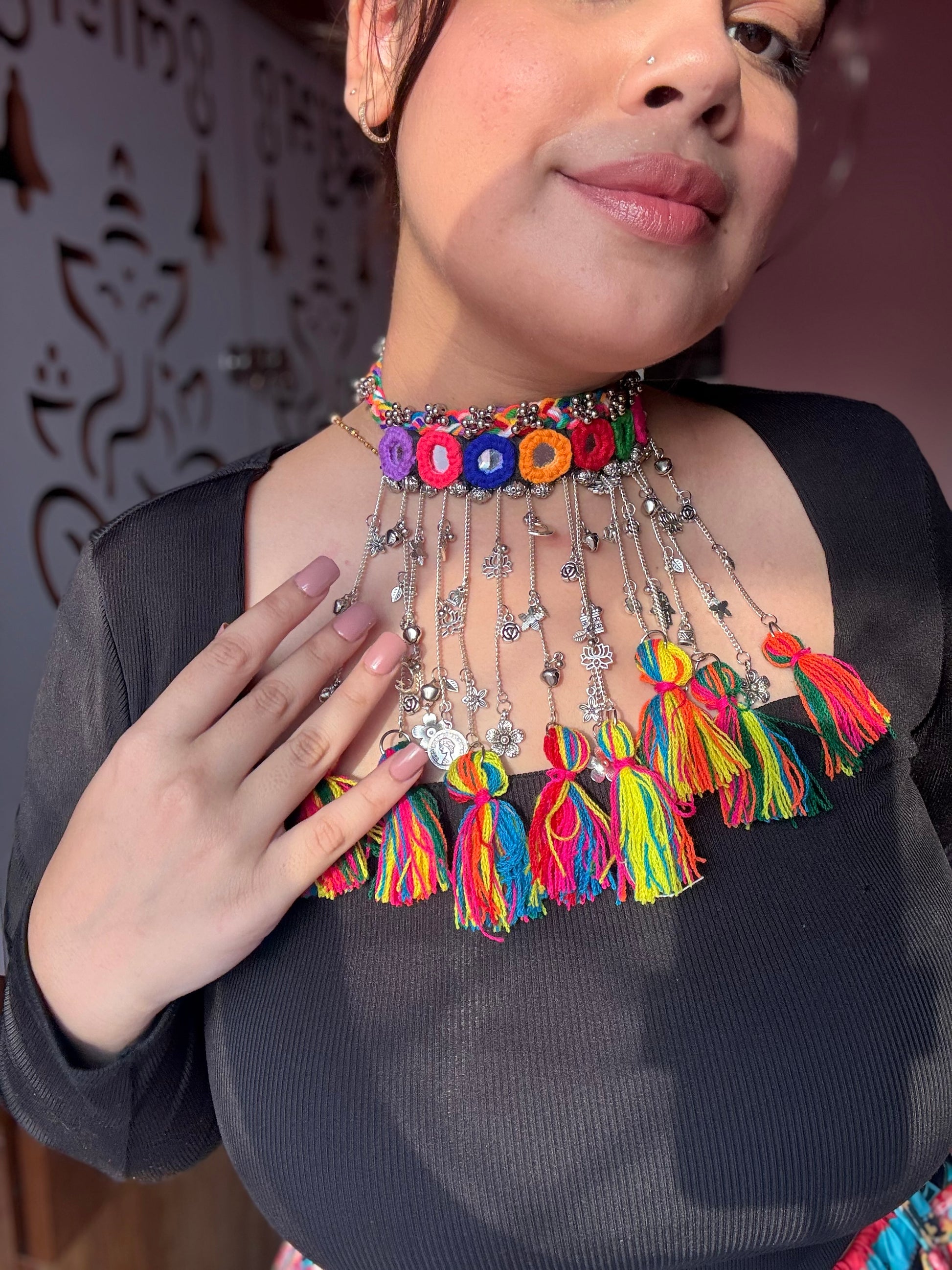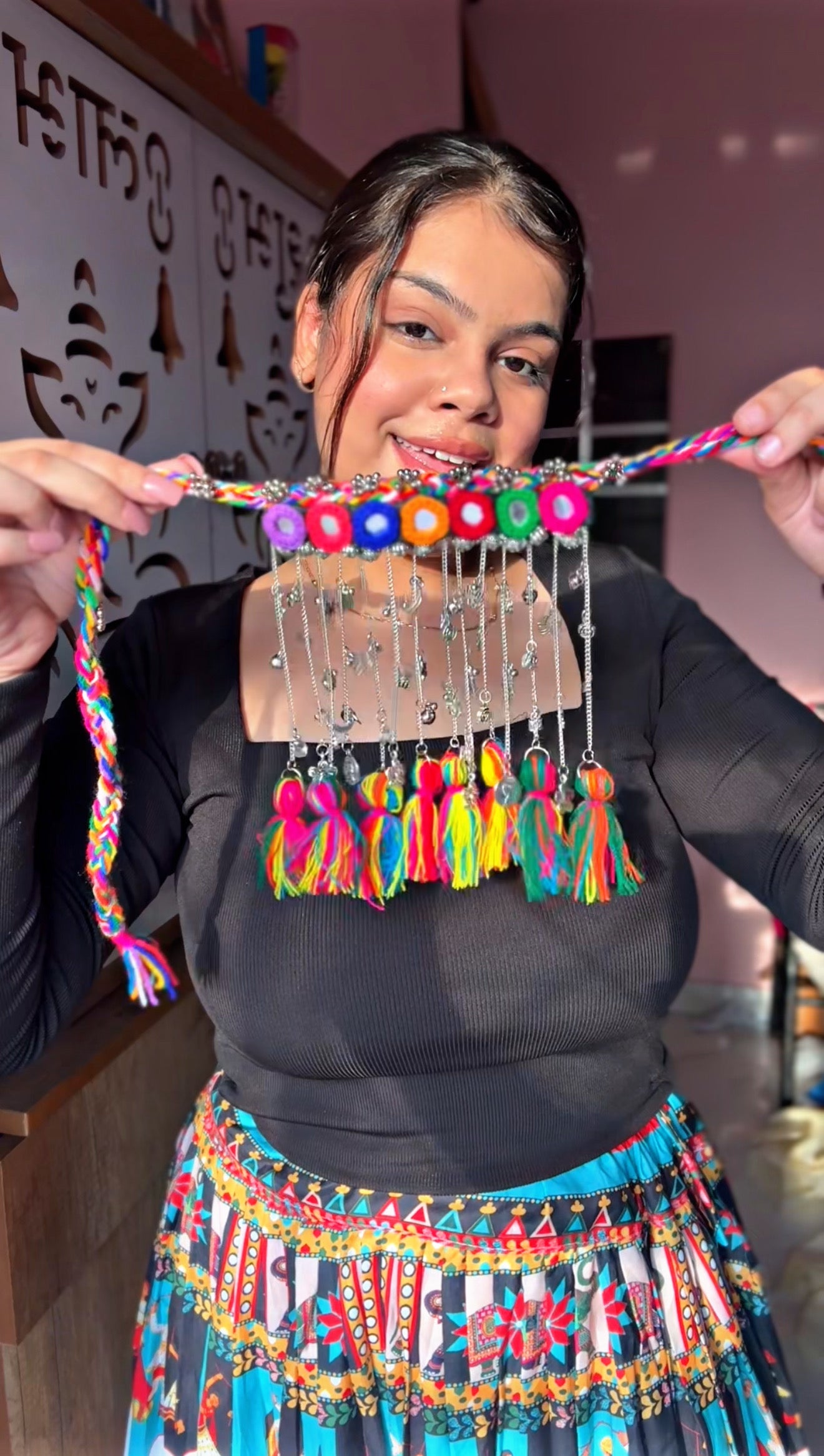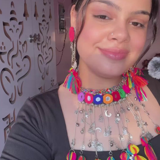 This neckpiece is straight-up fire, inspired by those epic Navratri nights. It's got all the colors, hand-embroidered with mirrors that catch the light. Think moon and lotus vibes, plus dangly bits that move when you do. And the best part? Ghunghroo bells for that *chef's kiss* sound when you're dancing or doing the Garba. Total main character energy and a perfect gift for your bestie! 💯