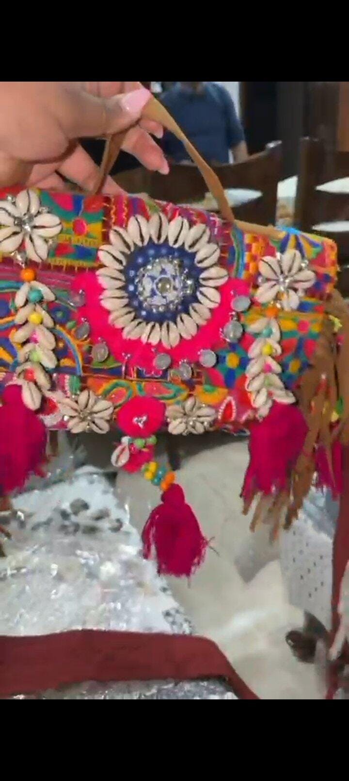 Measuring 10 by 8 inches, the bag is spacious enough to hold your essentials while maintaining a compact and stylish silhouette. The vibrant colors and reflective mirrors catch the light beautifully, adding a touch of glamour to any outfit. The shell work is meticulously done, giving the bag a unique texture and an organic feel that enhances its boho charm.