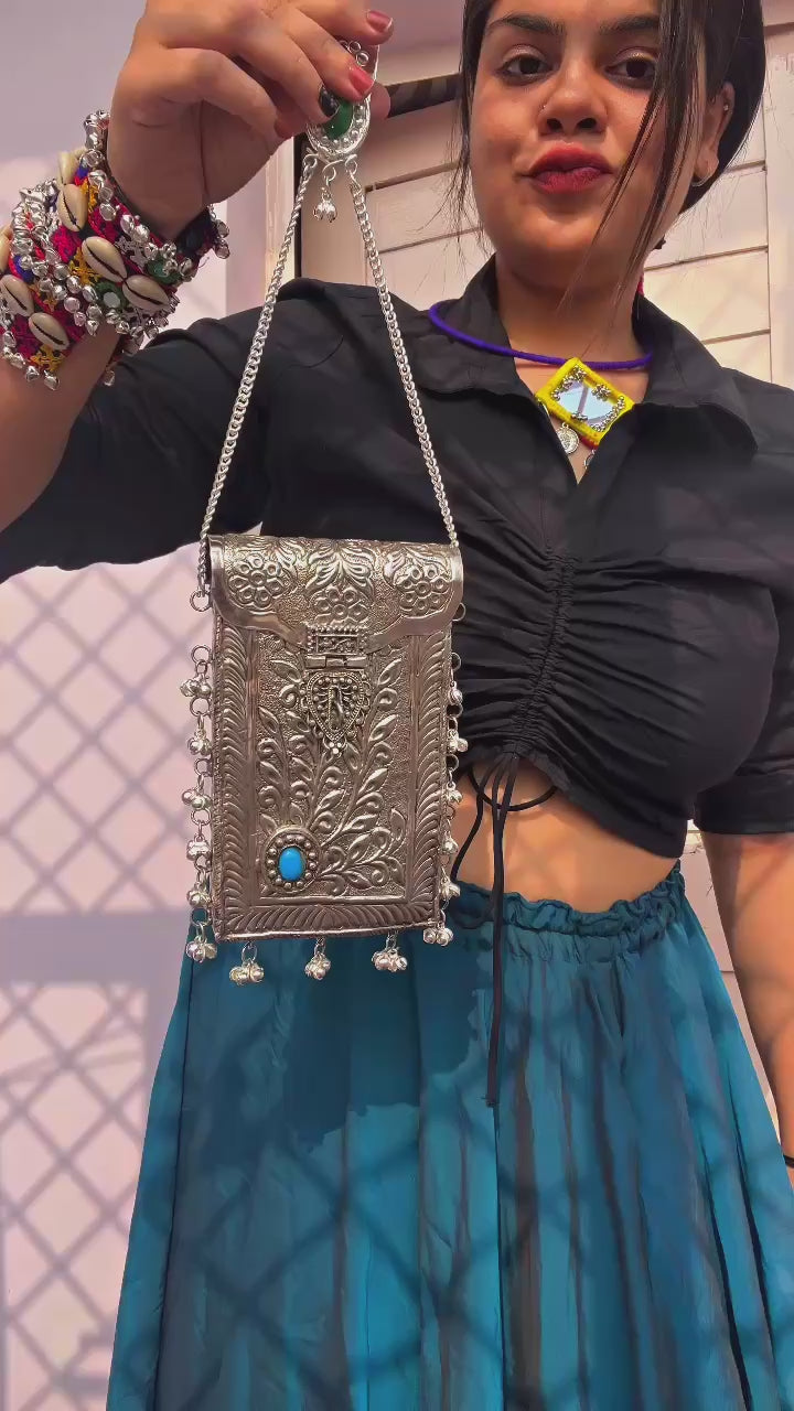 Introducing the Mirza phone sling, a stunning fusion of elegance and bohemian charm. Crafted from premium oxidized material, this sling not only exudes sophistication but also boasts a unique character that sets it apart. The intricate bohemian work is a testament to artisanal craftsmanship, showcasing a design that is both contemporary and timeless.