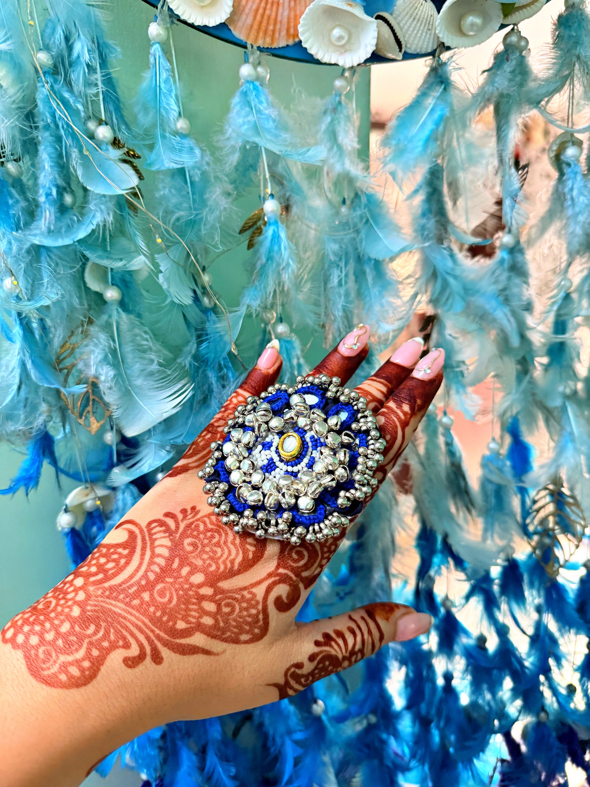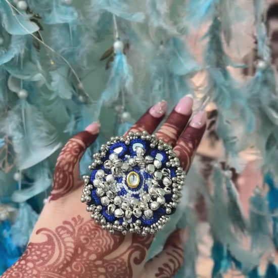 "Adorn your hand with the elegance of Nazia's handcrafted ring. This stunning piece boasts an adjustable design, ensuring a comfortable and customized fit for any hand. The ring is intricately detailed with genuine ghungroo work, creating a melodious touch with every movement. Sparkling mirror accents are carefully placed, reflecting light and adding a touch of glamour. The ring's rich blue hue provides a vibrant backdrop for the detailed craftsmanship, making it a truly eye-catching accessory. It's a perfect blend of traditional artistry and contemporary design, ideal for adding a unique flair to any outfit."