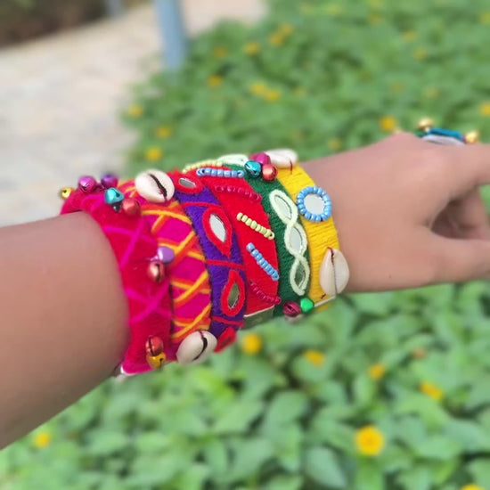 Our Rangini Bangles are a vibrant set of six handcrafted pieces designed to add a joyful pop to any look. Made with colorful threads, cowrie shells, beads, and tiny bells, each bangle celebrates the spirit of Indian artistry in a playful, boho way.