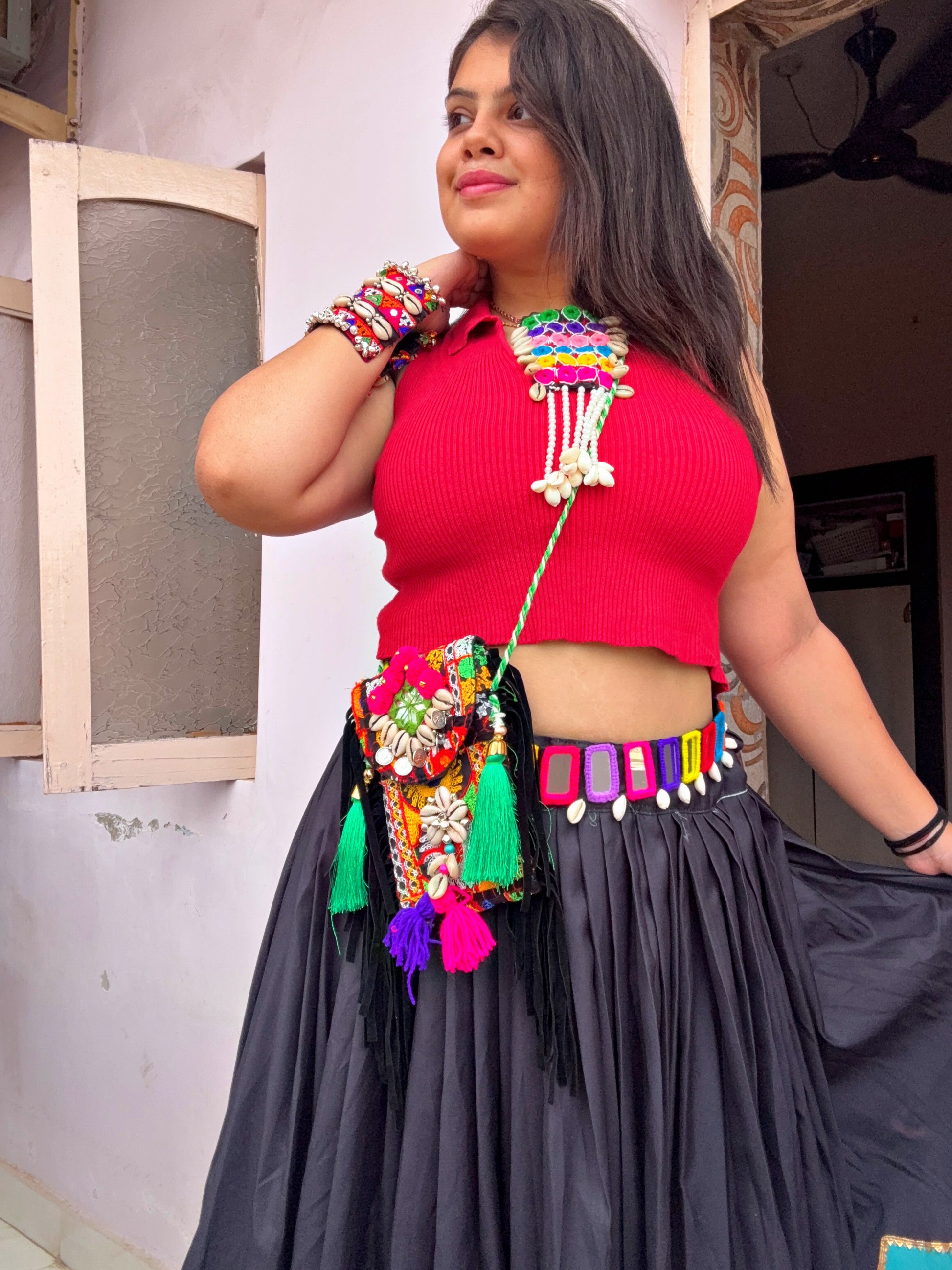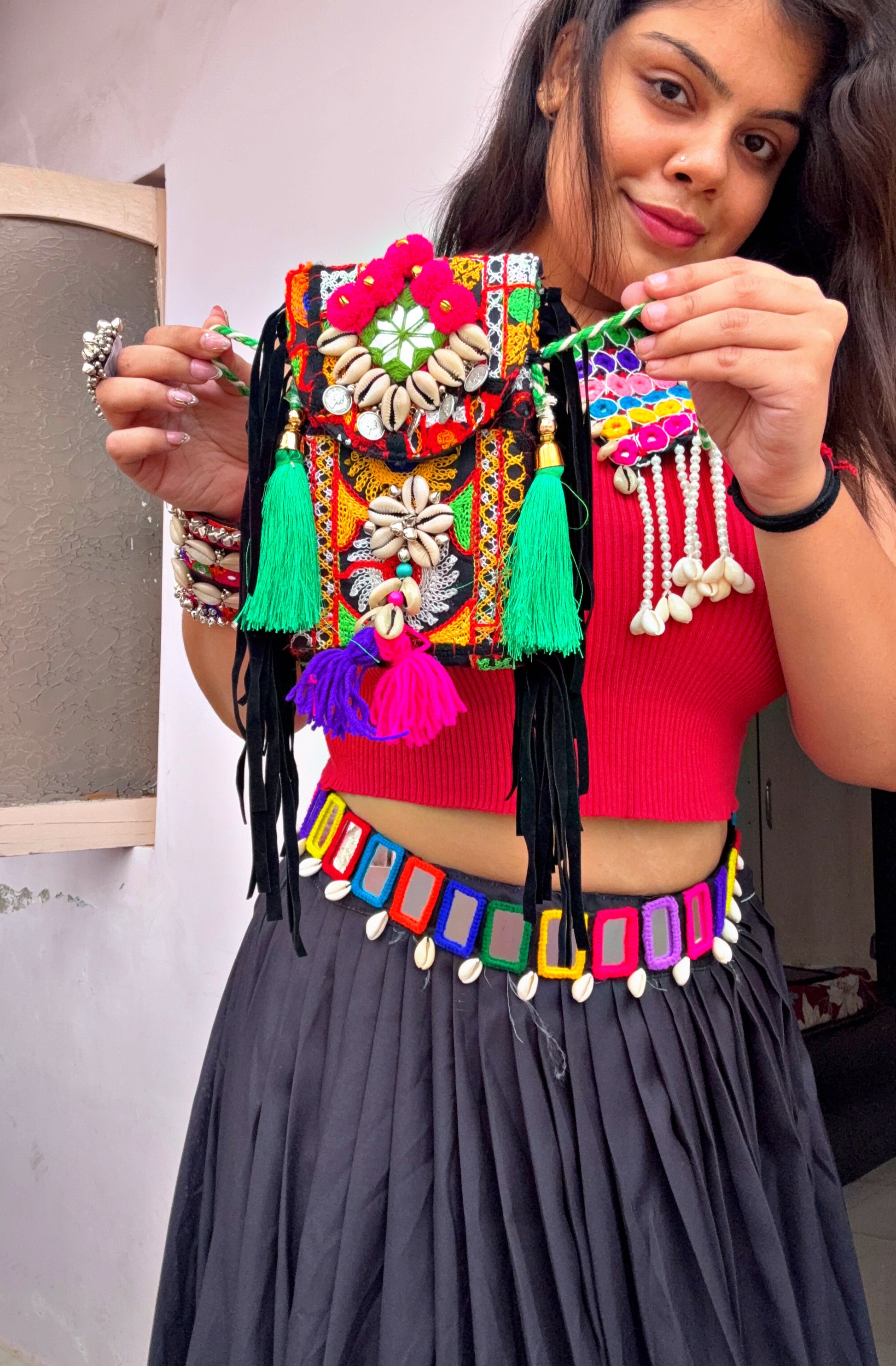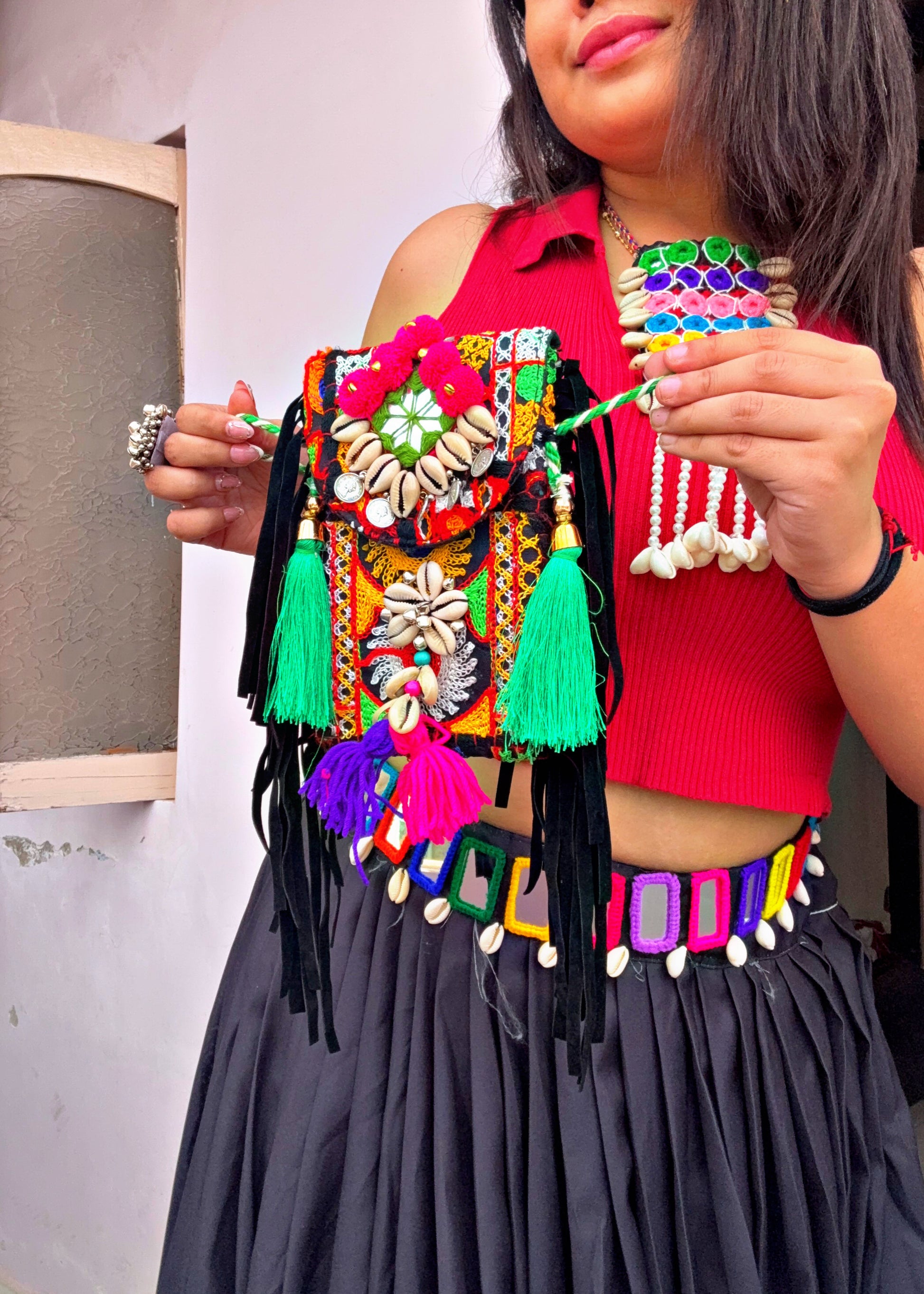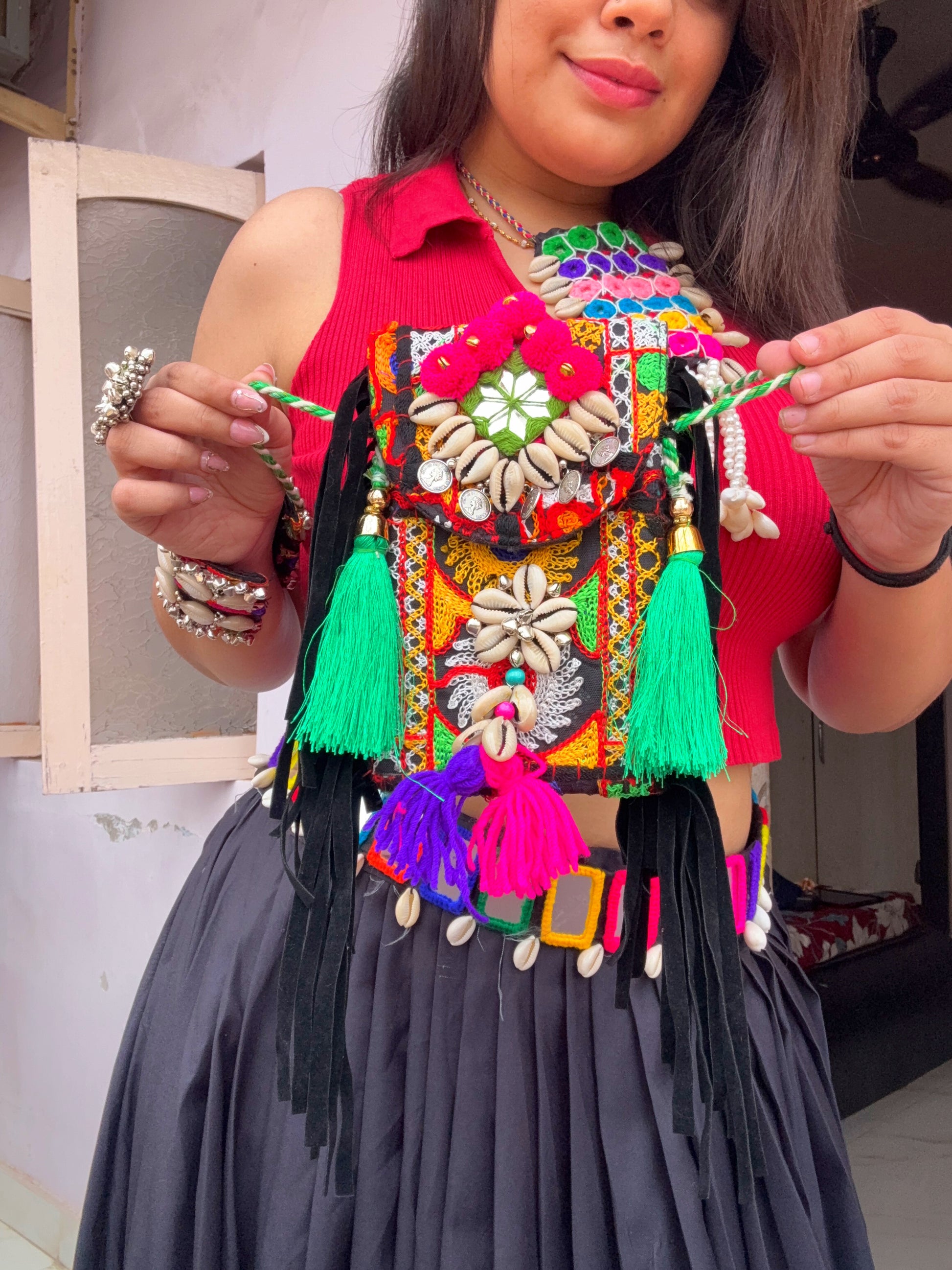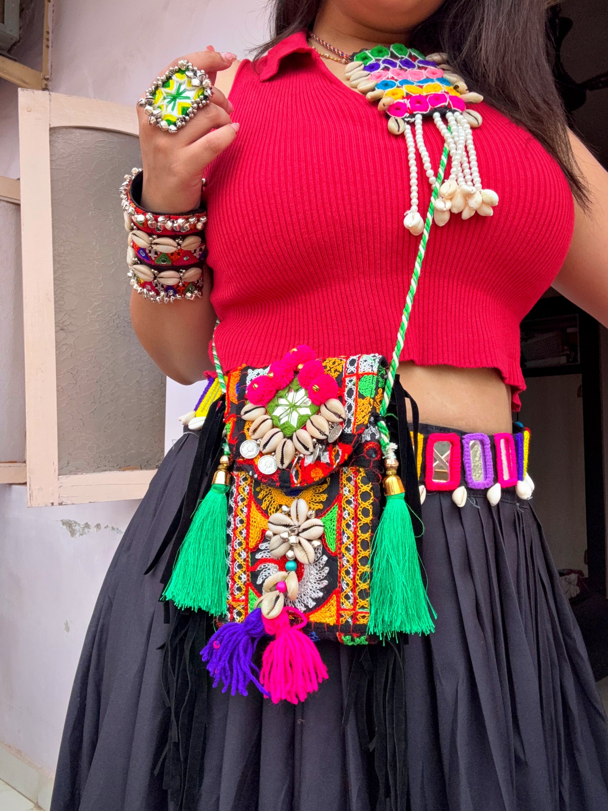 This phone sling is the perfect blend of style and practicality! The base is a sleek, black color, providing a versatile backdrop for the intricate details. Adorning the sling, you'll find delicate shell and mirror work, which catches the light beautifully and adds a touch of bohemian flair. To top it off, playful pompoms are attached, adding movement and a fun, whimsical element. It's a chic accessory that keeps your phone secure while elevating any outfit!