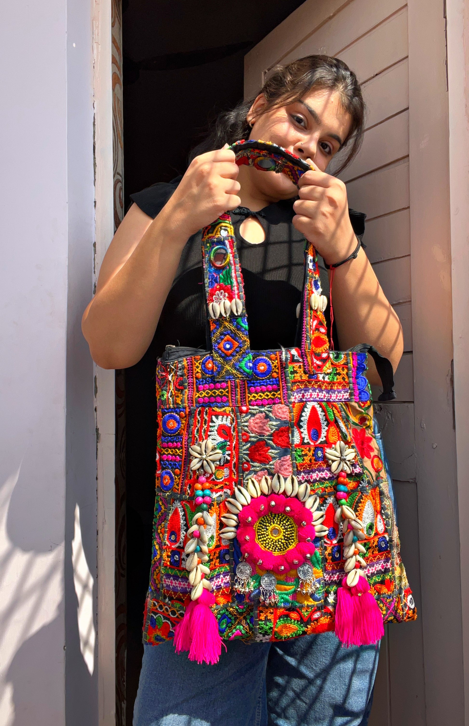 "The Mishti boho jhola bag is a vibrant celebration of bohemian style and grace. Inspired by the sweet, gentle nature of its namesake, this bag embodies a free-spirited charm. Its flowing silhouette and intricate details create a sense of effortless elegance. Perfect for the modern bohemian, the Mishti jhola bag is a stylish companion for your everyday adventures, adding a touch of sweetness and artistic flair to your unique style."