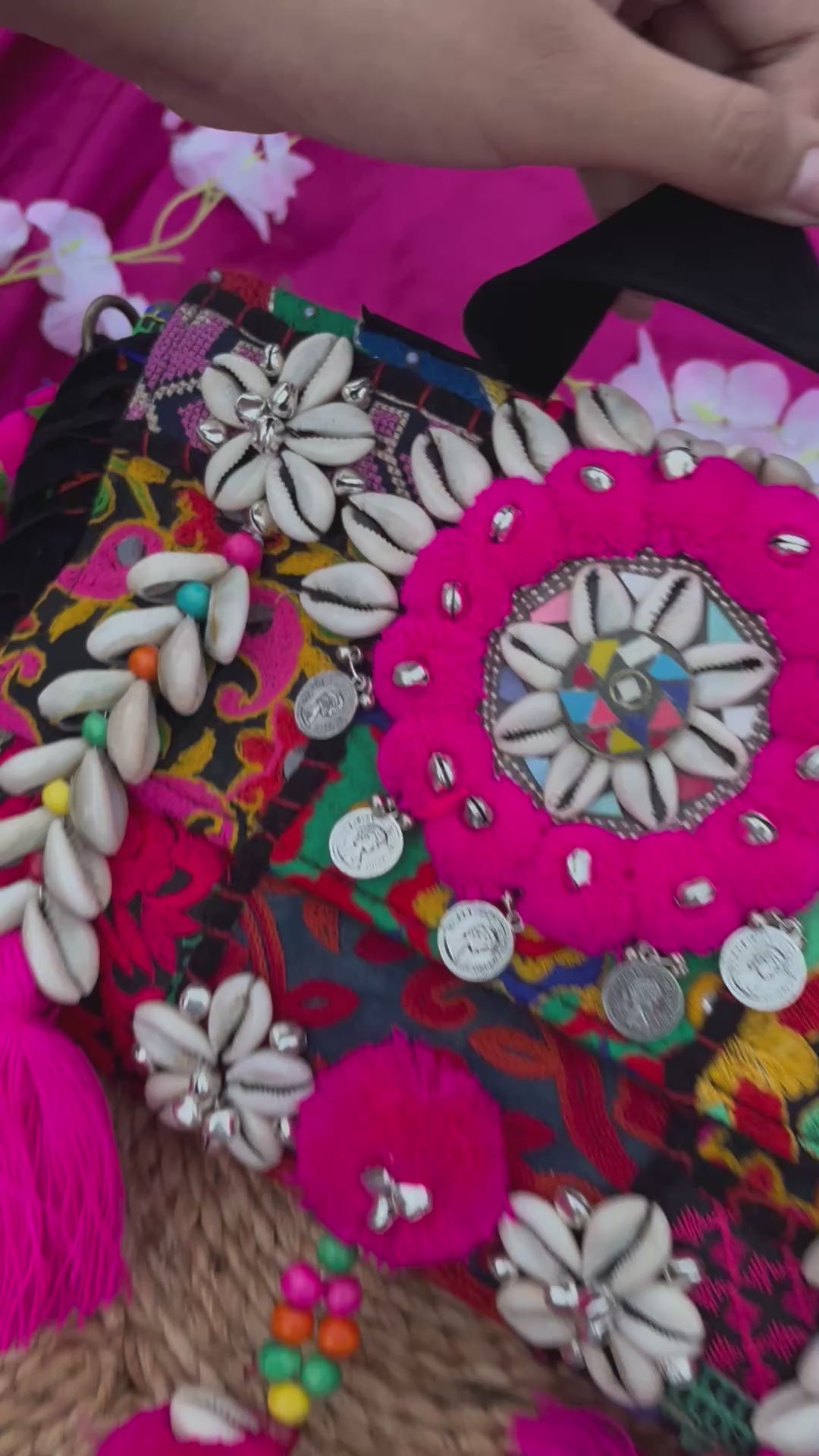 Adorned with playful pompoms that add a perfect pop of pink and shell work, this bag exudes bohemian flair. The heavy work belt ensures comfortable wear, while the 11 x 9 inch size offers ample space for your essentials. The Saaniya Boho Bag is more than just an accessory; it's a reflection of your individuality and appreciation for exquisite craftsmanship."